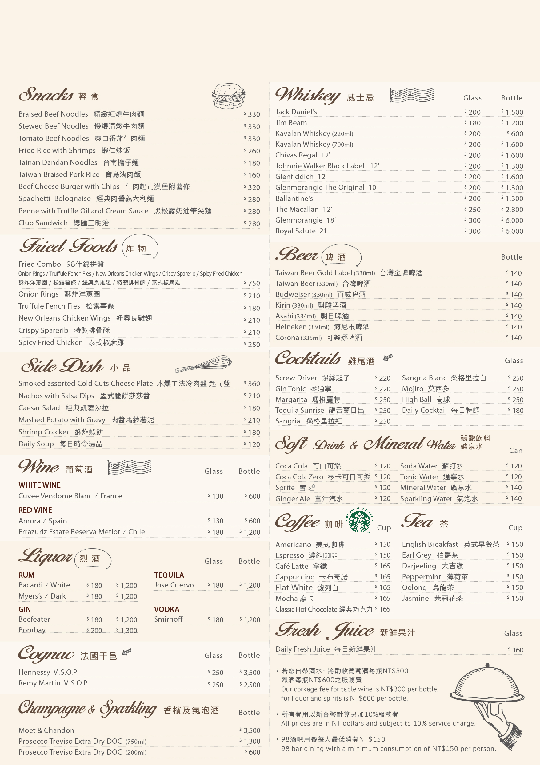 风尚感独具的98,提供经典酒款、各式调酒及精緻料理,也提供星巴克咖啡服务及义式美馔与炸物轻食、精緻蛋糕甜点。