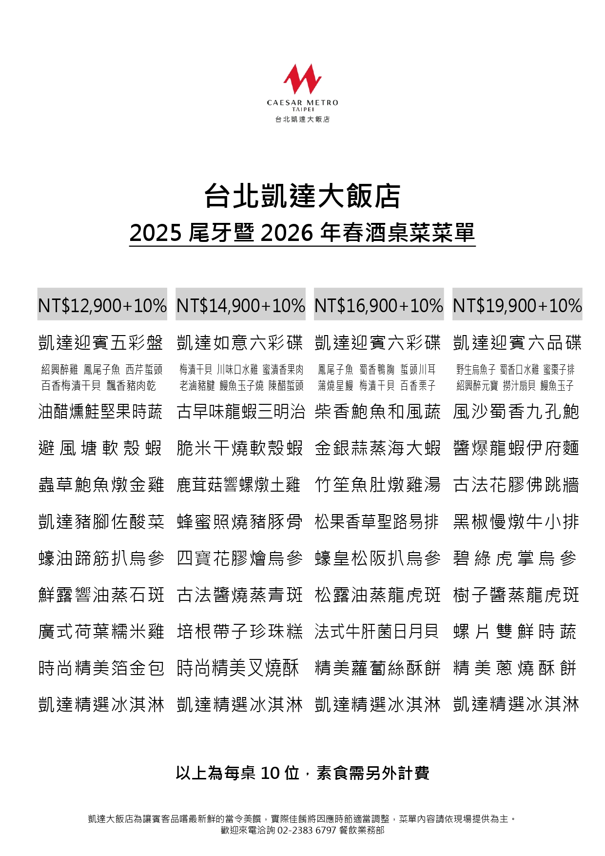 凡於2025/12/31前預訂,【家宴中餐廳尾牙春酒專案】,並支付兩成訂金