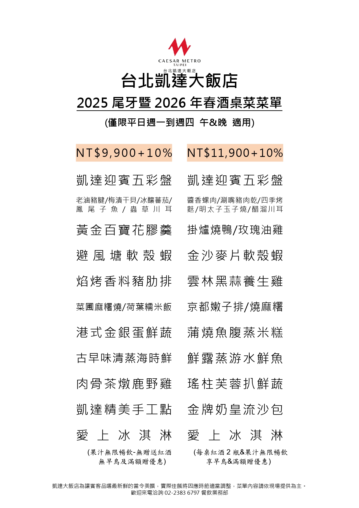 團圓時刻‧齊聚凱達 尾牙春酒饗宴,中式饗宴平日每桌 9,900+10%起,百宴自助餐廳平日每位850元
