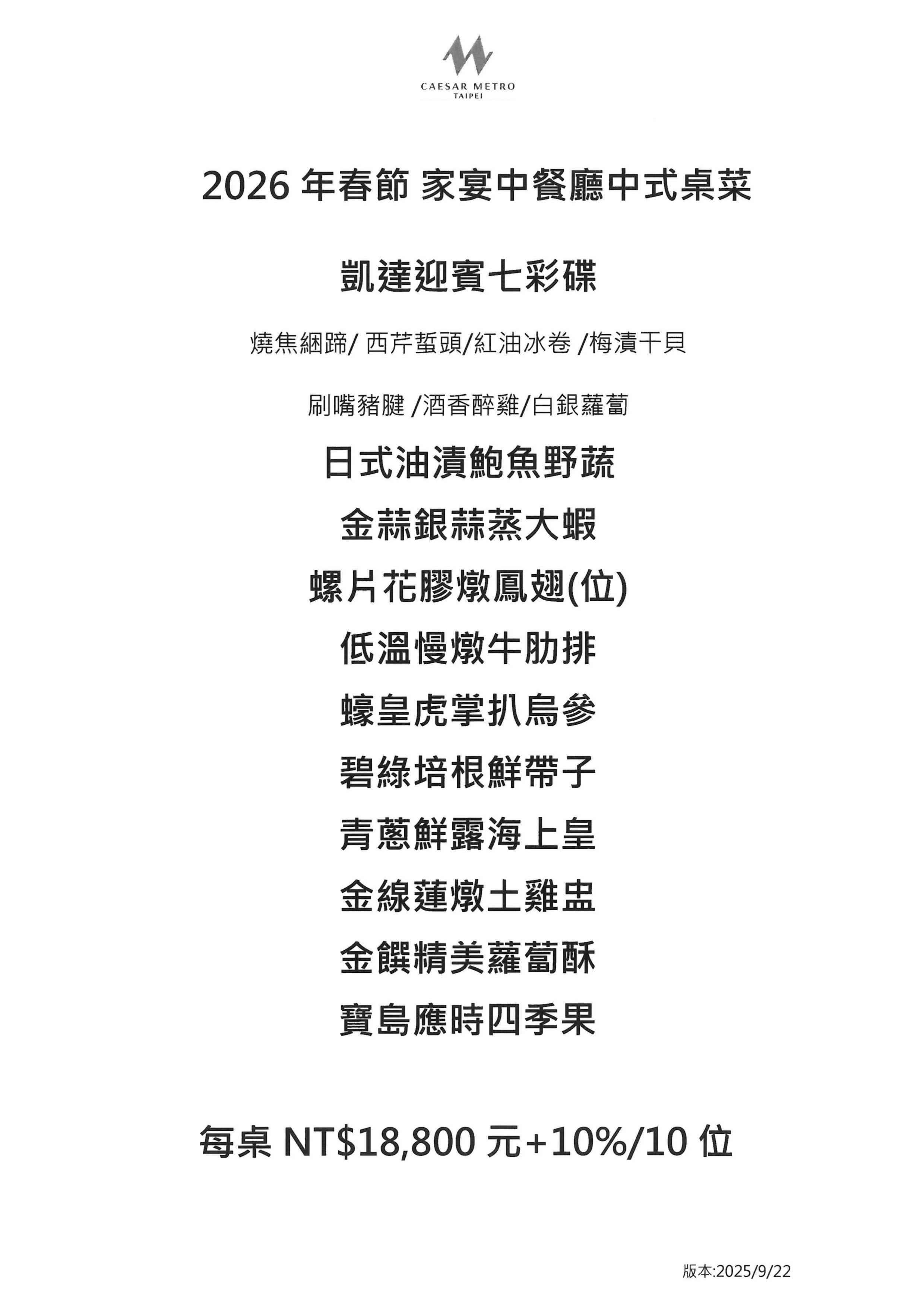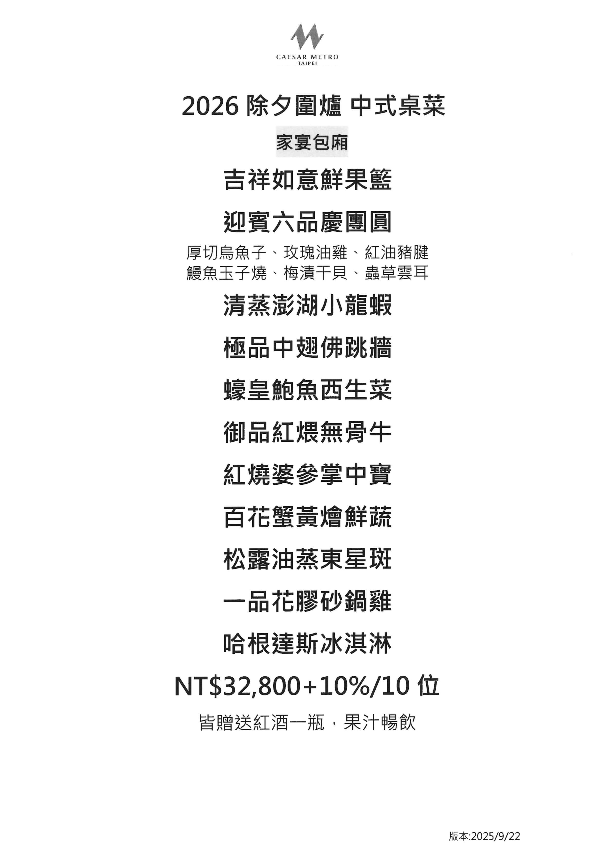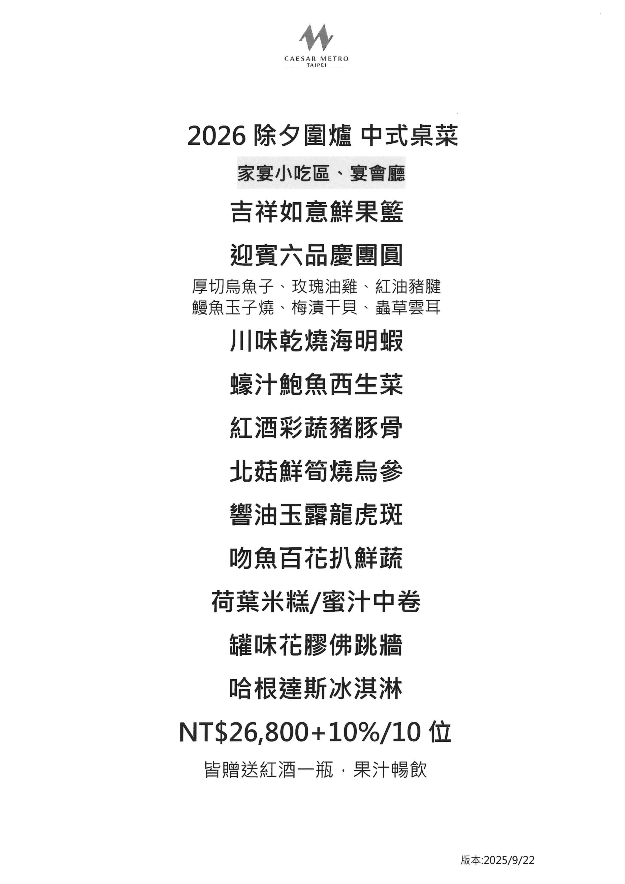 | 除夕晚餐 | 17:00-19:00 | 小吃區-$26,800 *10人起桌價 *加人加價$2,680元/人 |
