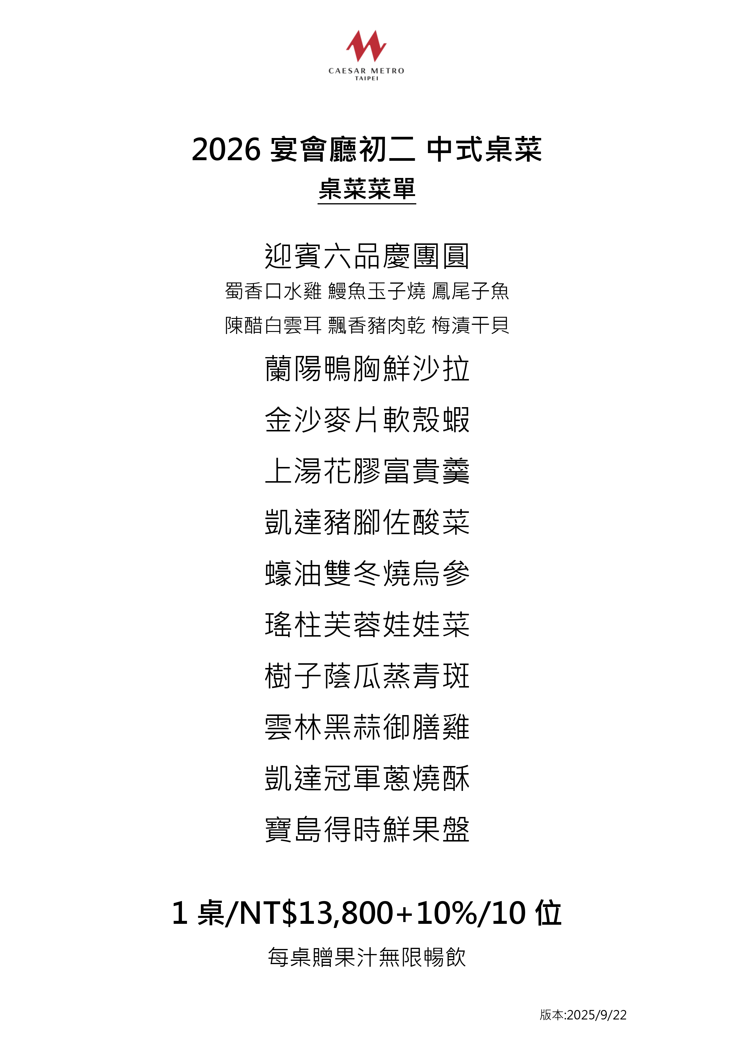 1. 支付全額餐費方始完成訂位。 2.皆須另加+10%服務費 3.每桌贈果汁暢飲 ‧ 宴會廳初二菜單 |